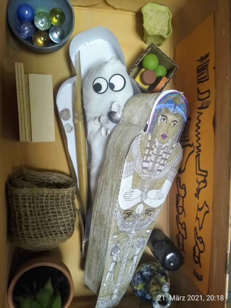 Im Homeschooling wurden wir kreativ!  Auch wenn unser Unterricht zurzeit etwas anders und häufig vor dem Bildschirm abläuft, entstehen viele beeindruckende, einfallsreiche Werke. Die Schüler*innen der 2y Klasse habe in ihrem Projekt im Geschichtsunterricht erfolgreich versucht, alles was sie über das alte Ägypten erfahren und gelernt haben, in ihrer Grabkammer im Schuhkarton umzusetzen.