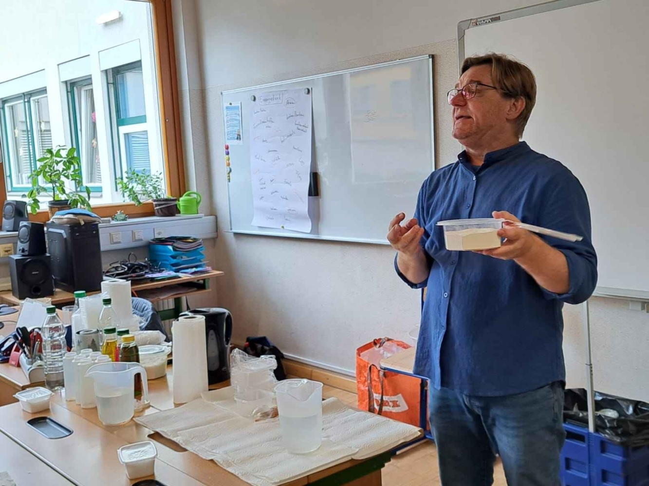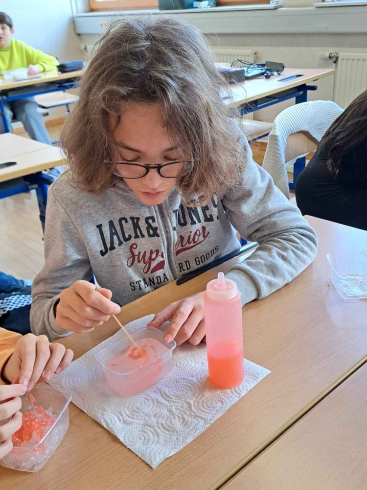Wie macht man aus dem Füllmaterial einfacher Windeln, den superabsorbierenden Polymeren oder Polyacrylaten Kunstschnee? Wie macht man aus Algenpulver durch Polymerisation Schleimwürmersoße im Glibberbad? Lorenz Giorgi vom Science Pool zeigte den Schülerinnen und Schülern der 3a bei seinem Workshop die zauberhafte Seite der Chemie.